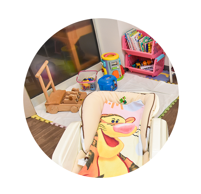 整体に通いたいのにお子さんを預けることが難しい方!当院ではキッズスペースを完備しています。ベッドのすぐそばにあるのでお子さんも安心です!